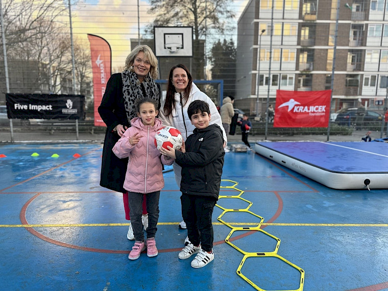 ©Krajicek Foundation/Beeld v.l.n.r Marieke Kolsteeg (Hef Wonen), Ulrike Insam (Krajicek Foundation), buurtkinderen Inara en Moussa