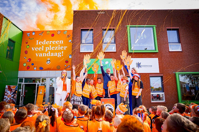 “Ola Ole Olee, ja we sporten met z’n allen, doe maar mee!” klonk het vrijdagochtend 17 april door de speakers in Zeewolde. Binnen een paar minuten stond het hele schoolplein vol kinderen in beweging. Geen gewone schooldag, maar een dag vol energie, sport en plezier. Dat was de 14e editie van de Koningsspelen.